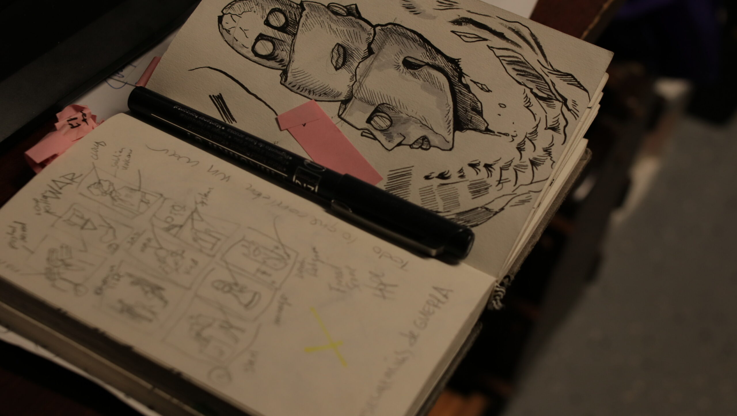A artist explaining the process of his series sketches. and work on studio. Episode 1 series